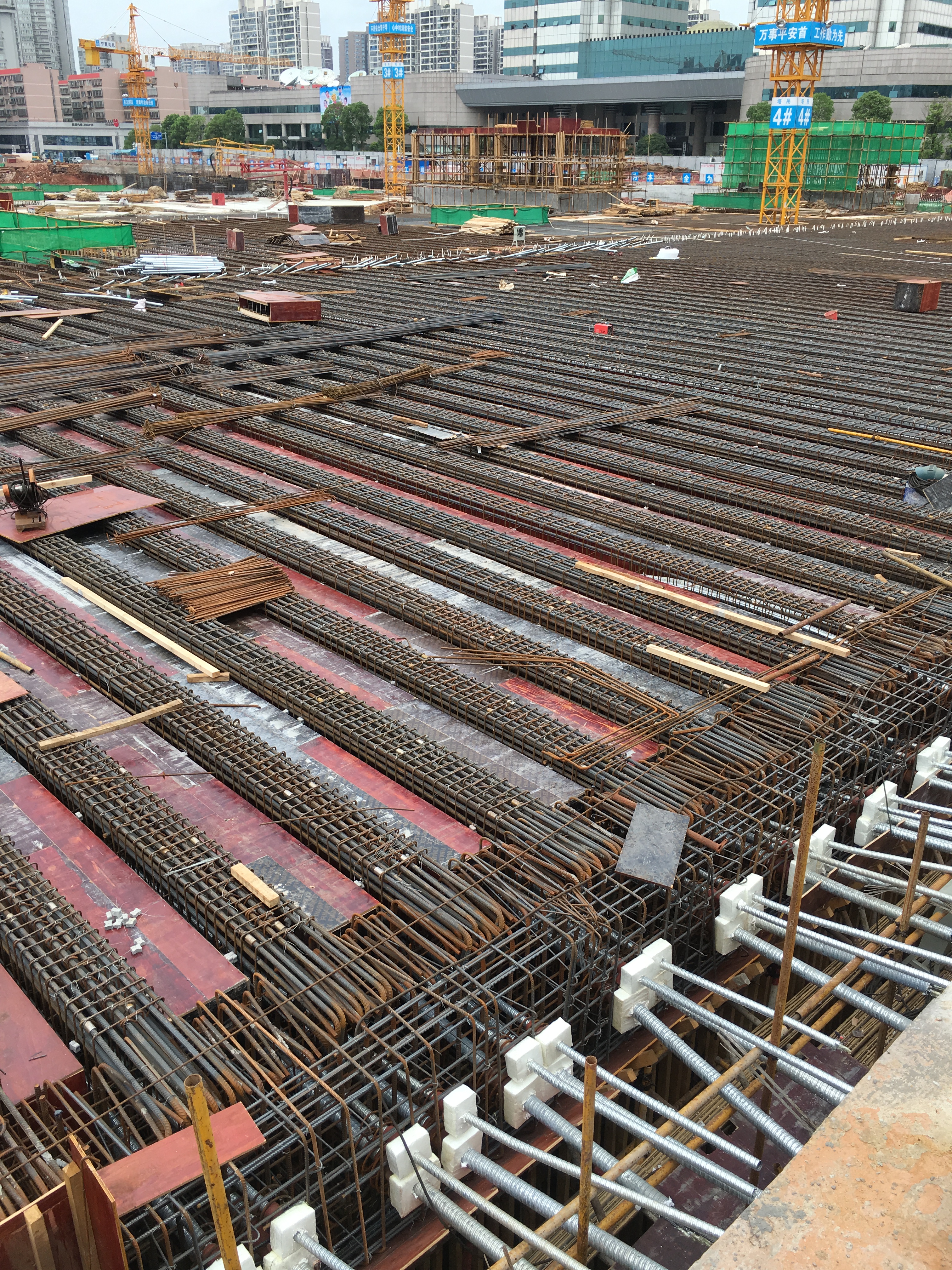 此次封顶区域是整个广场改造项目土建施工中难度最大的部分,包含预应力密肋梁区域2400平方米,支模高度约10米,共80根跨度32米的密肋梁,梁截面尺寸0.4米*1.9米,梁净距仅0.5米,支模难度巨大,且密肋梁区域钢筋重量达到900吨,混凝土重量约为8400吨,为保证施工质量和浇筑安全就该区域支模方案进行了多次专家论证,并采用BIM技术对支模方案及施工过程进行了全程可视化模拟。
