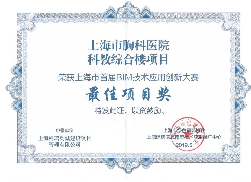 由我司承担BIM全过程应用咨询服务的上海市胸科医院科教综合楼项目,在业主方驱动的实施模式下,顺利通过了上海市住建委与BIM推广中心验收,近日荣获上海市首届BIM技术应用创新大赛“最佳项目奖”。