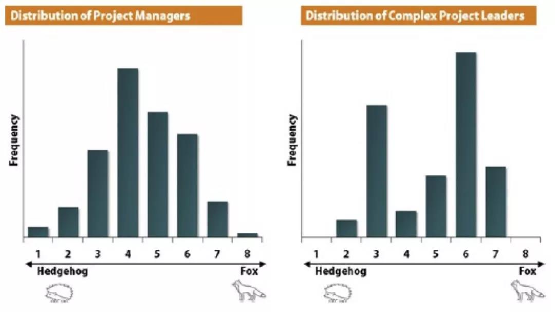 项目领导力需要通才或者专才、个性、情商以及经验等四方面特征。在通才或者专才方面,一个哲学家分类理论是“刺猬和狐狸”,即刺猬只关注一个重要的事情,而狐狸则知道很多事情。下图是一般项目经理和重大项目经理的特征分布情况。显然,一般项目经理侧重于二者兼顾,而重大工程领导则较为极端。但进一步考察发现,具有狐狸特征的项目领导更容易让项目取得成功。在和优秀中的优秀(best-of-the-best)重大工程领导的访谈后,发现了一个有意思的现象:尽管他们具有通才特征,但他们之前的职业生涯往往是专家,而且是非常成功的专家。