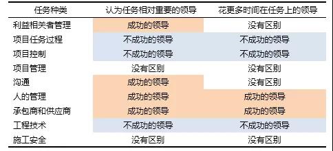 领导者具有九大任务:利益相关者管理、沟通、项目工作过程、人员管理、项目控制、承包商和供应商管理、项目管理、工程技术、施工安全。在这九个方面,一般项目经理和重大工程项目经理的区别如下表。可见,成功的重大工程领导和一般项目经理,虽然都花了很多时间在利益相关者和沟通上,但二者对这些任务认识的差异影响了结果。总体上而言,成功的重大工程领导花了更多时间在软性领导力方面,而不成功的重大工程领导则把更多时间花在了技术、程序和账务交易(transactional side of the ledger)方面。