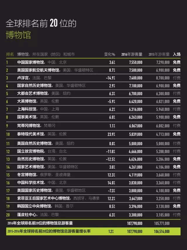 全球TOP20的博物馆在2016年创造了1.08亿游客人次的新高,实现了1.2%的增长。其中,中国国家博物馆以755万接待人次取代法国的卢浮宫,位列榜首。北美、欧洲、中东、非洲等地区博物馆的游客量涨幅,则呈现出明显的高低两个极端。英国泰特美术馆完成扩建后游客量增长近25%,俄罗斯特列季亚科夫画廊的游客量更是增长了近一半,而巴黎卢浮宫的游客量却同比下降近15%。