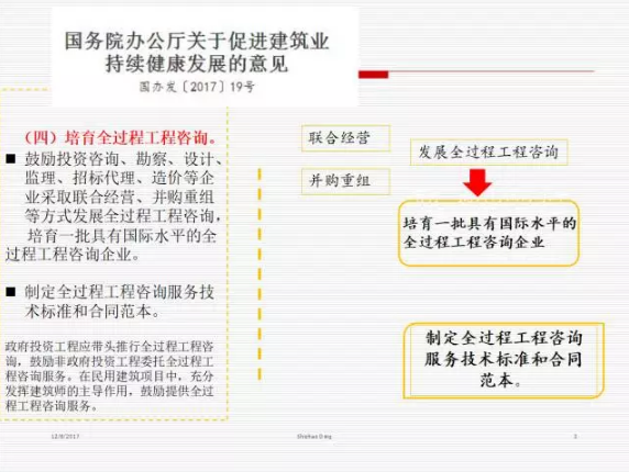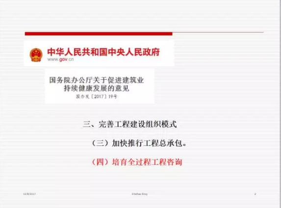 2017年2月,国务院办公厅发布《关于促进建筑业持续健康发展的意见》(国办发〔2017〕19号),提出要进一步深化建筑业“放管服”改革,加快产业升级,促进建筑业持续健康发展,并明确要培育全过程工程咨询。