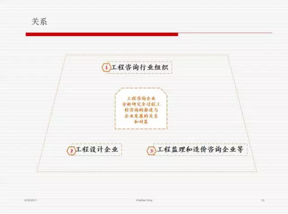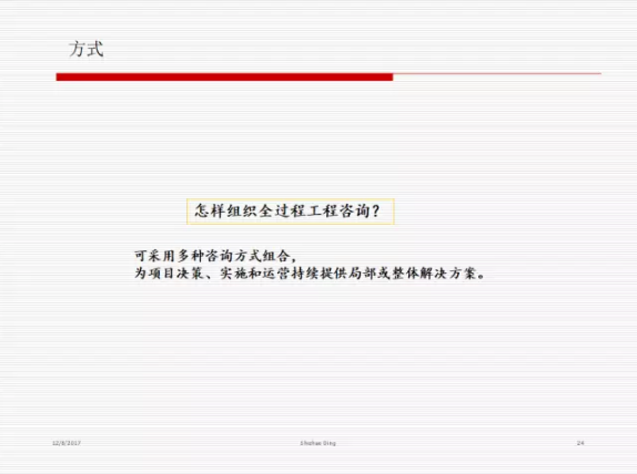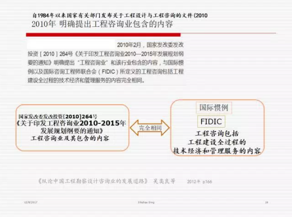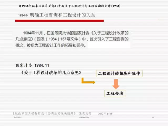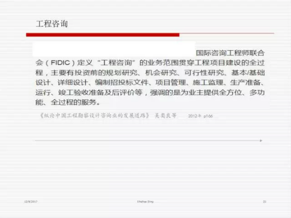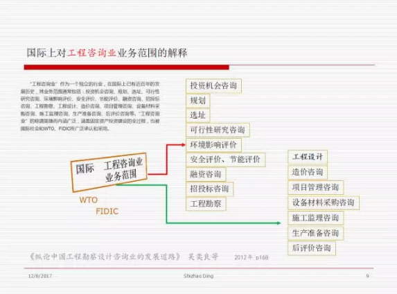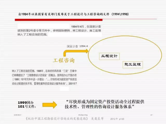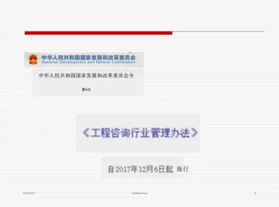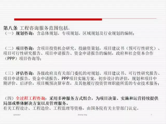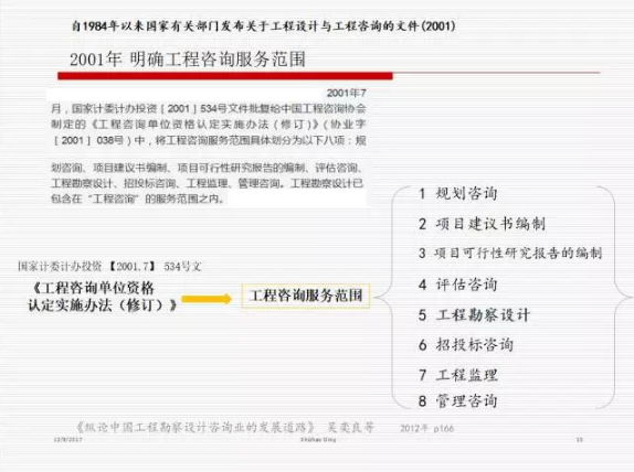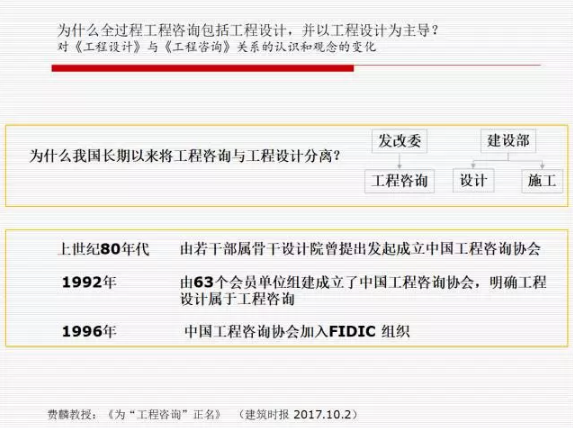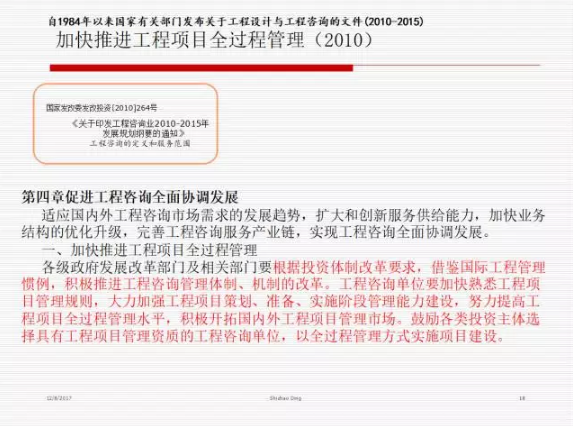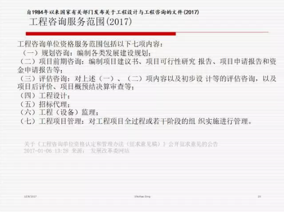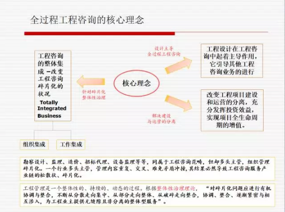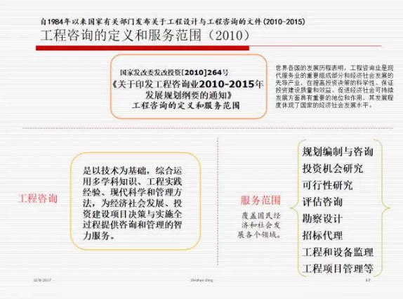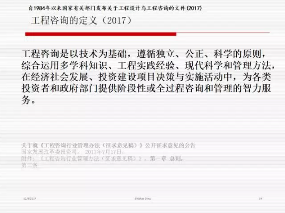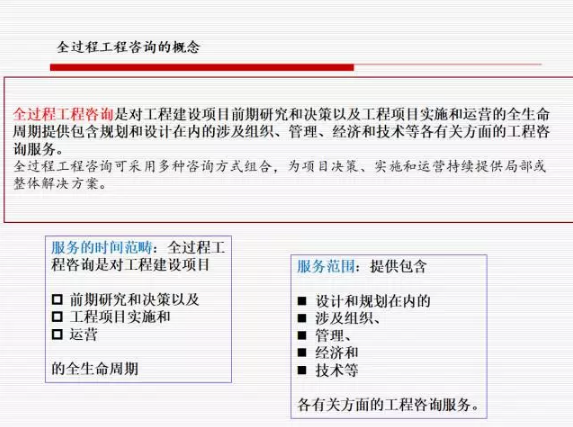 2017年11月,国家发改委发布《工程咨询行业管理办法》(2017年第9号令),自2017年12月6日起施行。该办法中明确“工程咨询是遵循独立、公正、科学的原则,综合运用多学科知识、工程实践经验、现代科学和管理方法,在经济社会发展、境内外投资建设项目决策与实施活动中,为投资者和政府部门提供阶段性或全过程咨询和管理的智力服务。”