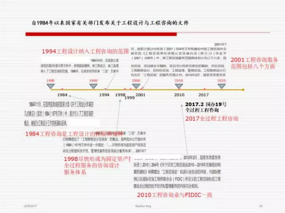 2017年5月,住建部发布了《全过程工程咨询试点工作的通知》(建市〔2017〕101号),选择8省(市)及40家企业开展全过程工程咨询试点,其中广东省为试点地区之一,深圳也有3家企业被确定为试点企业。