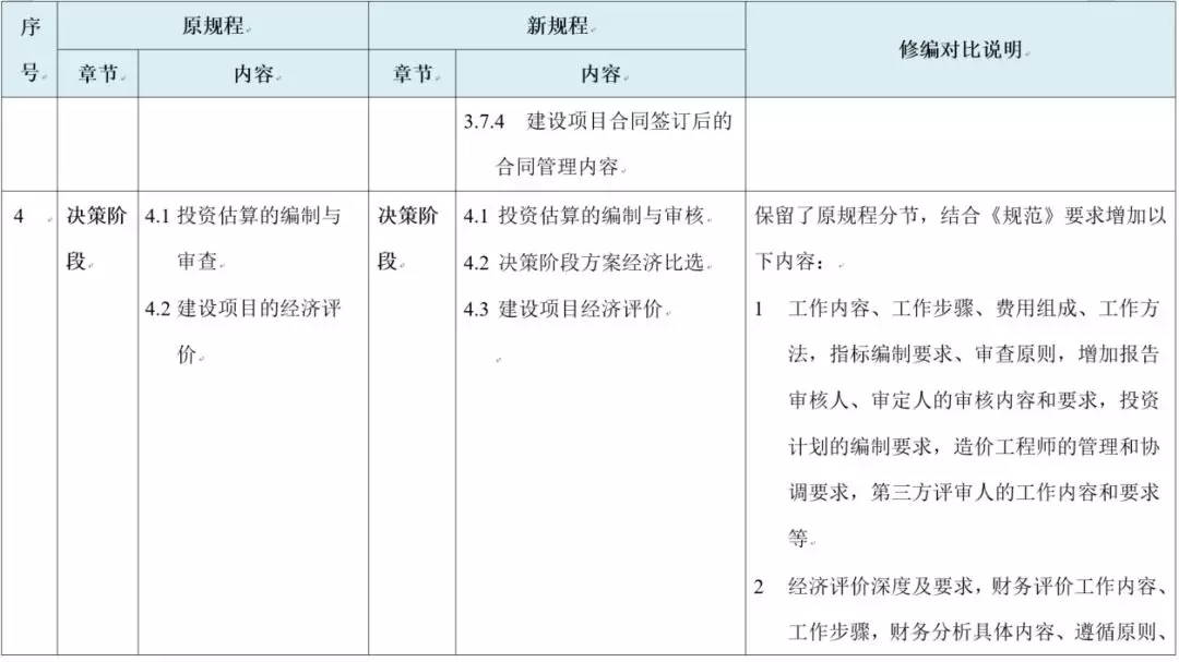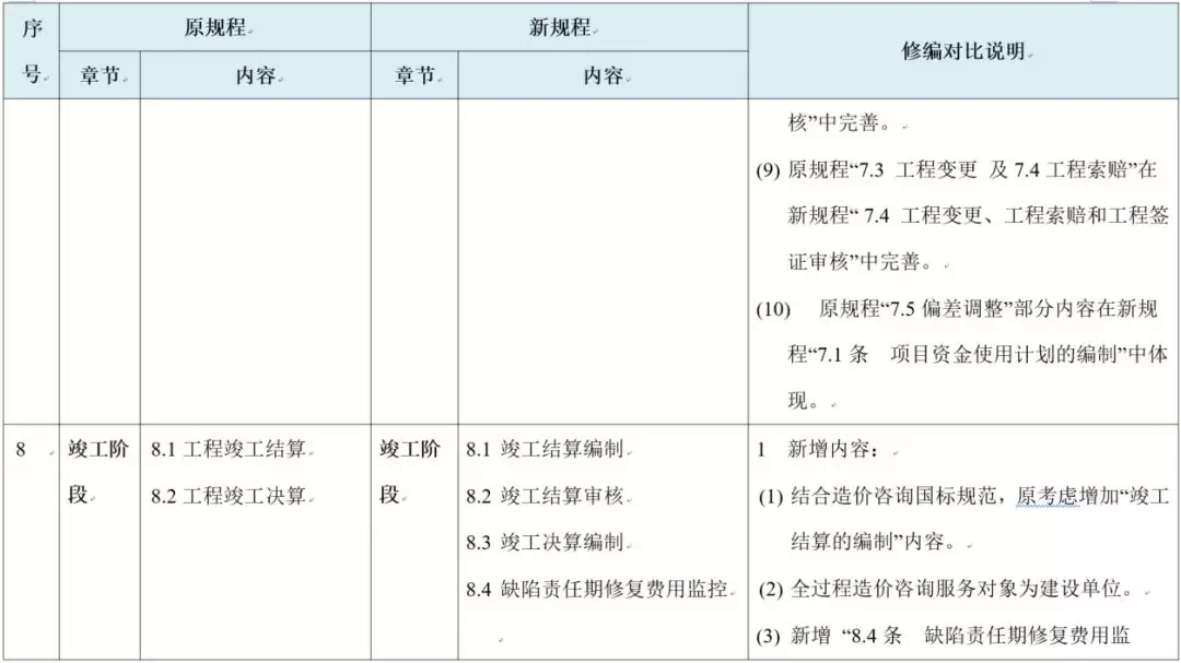 修订后的《建设项目全过程造价咨询规程》包含总则、术语、基本规定、决策阶段、设计阶段、发承包阶段、实施阶段、竣工阶段、附表及条文说明章节,与原规程对比如下: