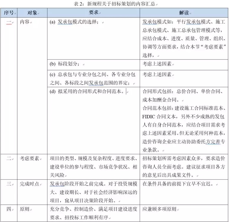 �解读:招标策划指对招标活动事先的计划和准备,是建设项目合同管理的重要环节。本条规定了招标策划的内容、应考虑因素、完成时点、原则。工程造价咨询企业应根据项目特点、开发主体特征、管理要求等进行招标策划。招标策划的结论可能不唯一,每种招标策划方案均有其优缺点,应选择相对最合理的招标策划方案。笔者将新规程关于招标策划的内容汇总如表2所示。