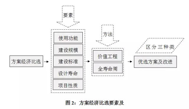 �4.2.2 方案经济比选应结合建设项目的使用功能、建设规模、建设标准、设计寿命、项目性质等要素,运用价值工程、全寿命周期成本等方法进行分析,提出优选方案及改进建议,其中:
