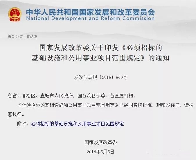 国家发改委发布《必须招标的基础设施和公用事业项目范围规定》